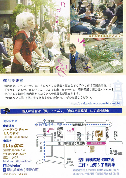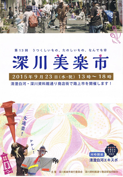 お知らせ 深川美楽市 2015・秋 2015/09/192020/06/29 銀座奥野ビル306号室プロジェクトでは、春の深川美楽市にひきつづき、秋の市にも参加します。 皆様のお越しをお待ちしています。 期間: 2015年9月23日(祝) 時間: 13時〜18時 場所: 深川資料館通り商店街 (三好・白川3丁目界隈) *雨天時は「深川いっぷく」「商店街事務所」にて開催
